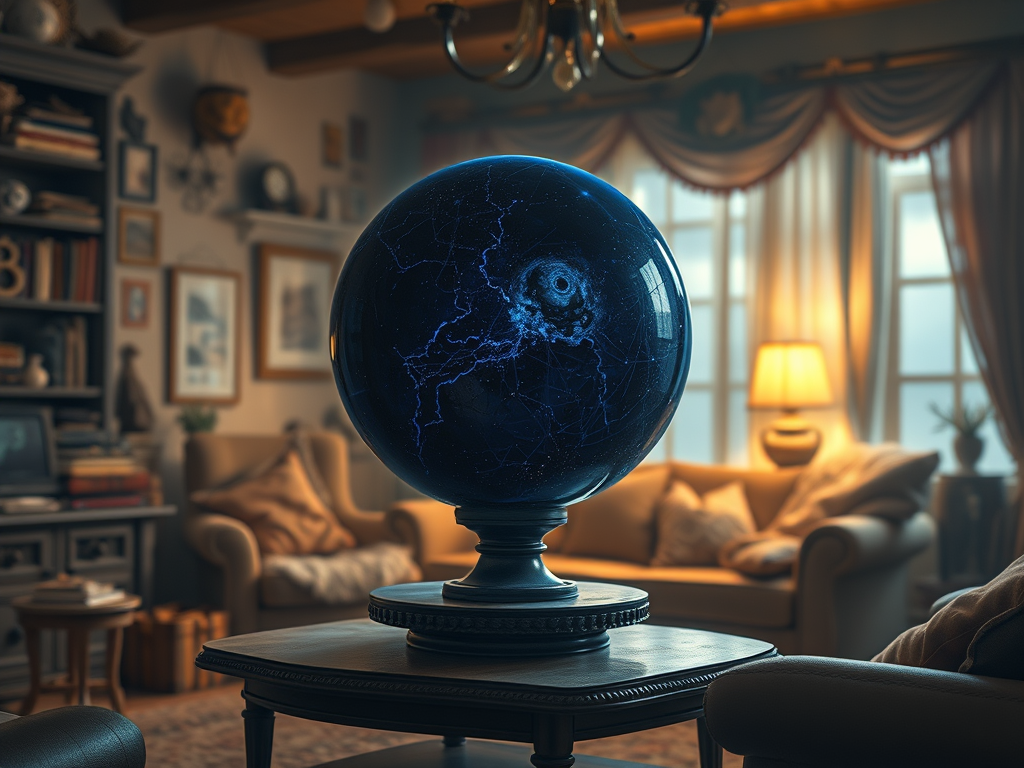 A glowing, three-dimensional star map suspended in deep space, viewed from inside an alien spacecraft, stars connected by luminous lines forming trade routes, central focus on a binary star system resembling Zeta Reticuli, the map appears hand-drawn yet futuristic, hovering in a dark chamber with subtle alien instrumentation, mysterious and ethereal lighting, inspired by Betty Hill’s hypnosis sketches, symbolic and slightly surreal, cosmic cartography aesthetic.